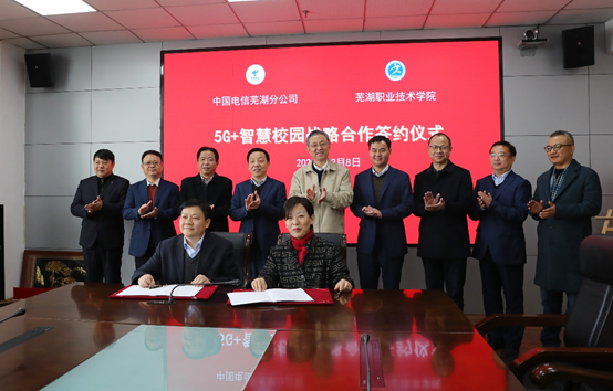 12月8日,学校与中国电信芜湖分公司5G+智慧校园合作签约仪式在正德楼1112室举行。中国电信芜湖分公司党委书记、总经理谷开鸿,党委委员、副总经理王大保及公司相关部门负责人,我校党委副书记、校长高武,副校长刘育红,校企合作处、信息化建设与管理处、网络工程学院相关负责人出席签约。签约仪式由校企合作处处长王世友主持。