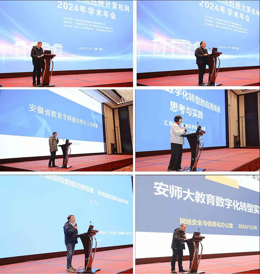 安徽师范大学党委常委、组织部部长朱为民、安徽省教育厅科研处副处长杨修顺分别为大会致辞。本次学术年会聚焦安徽高校的数字化转型进行研讨交流,中国科学技术大学网络信息中心副主任、安徽省教育和科研计算机网网络中心副主任张焕杰,安徽财经大学图书与信息中心副主任(副馆长)闻帅,安徽省教育和科研计算机网网络中心副主任、赛尔网络安徽分公司总经理张炎谨,巢湖学院信息化处副处长侯加兵,阜阳师范大学信息化中心主任邹县芳,皖南医学院办公室(网信办)副主任张业睿,安徽师范大学网络安全与信息化办公室主任吴长义,我校信息化建设与管理处副处长王钧,分别为大会做了主题报告。