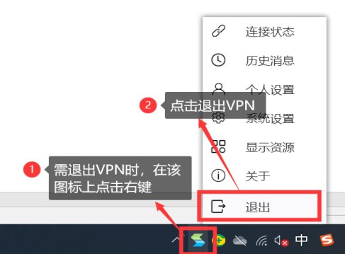 当您无须访问校内资源时,在任务栏选择VPN图标右击,在弹出的菜单中选择【退出】即可。