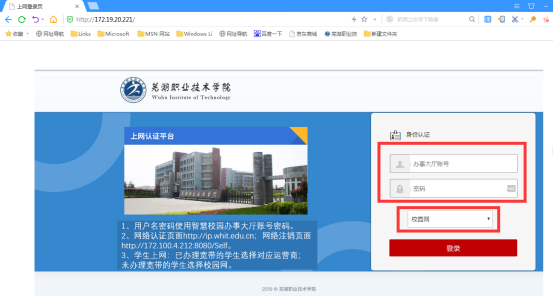 网络认证页面:http://172.19.20.221/ 输入账号、密码,运营商选择校园网,进行登录即可。