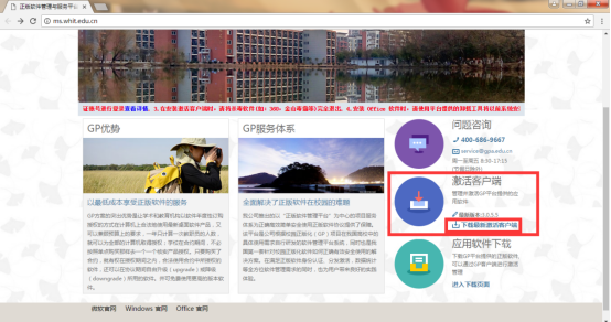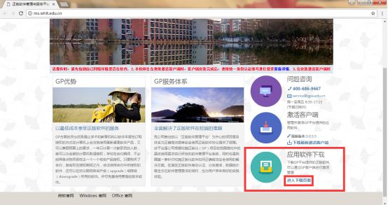 1. 在浏览器输入网页地址http://ms.whit.edu.cn/进入本校【正版软件管理与服务平台】,在右下角可见【应用软件下载】栏目